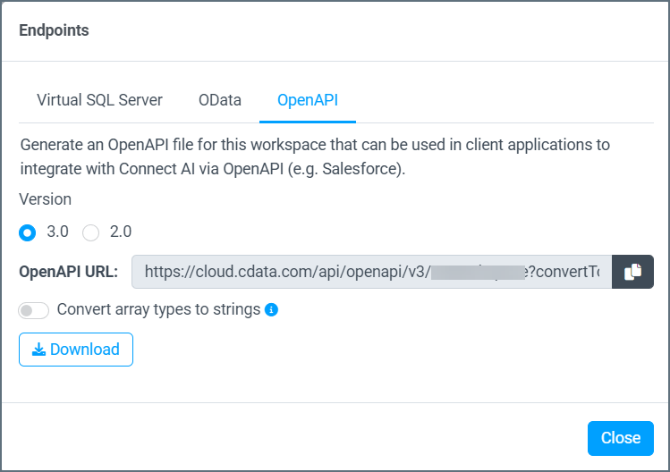 You can generate an OpenAPI specification file for a selected workspace. This file can be used in client applications to integrate with Connect AI via OpenAPI. To generate an OpenAPI specification file:Select the workspace in which to generate an OpenAPI specification file. This file can be used in client applications to integrate with Connect AI via OpenAPI.