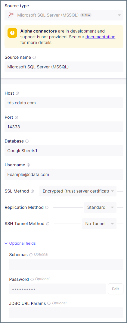 To establish a connection from Airbyte to the Connect AI Virtual SQL Server API, follow these steps.1