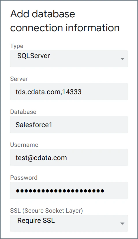 - Server—enter the Virtual SQL Server endpoint and port separated by a comma: tds.cdata.com,14333