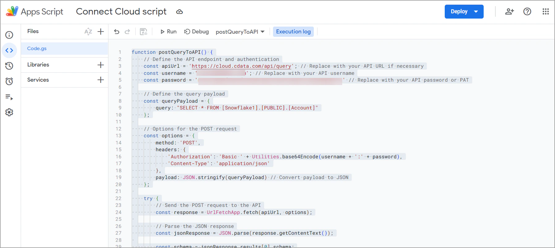 In order to connect from Apps Script to Connect AI via the Query API, you need the following information:- URL—https://cloud.cdata.com/api/query