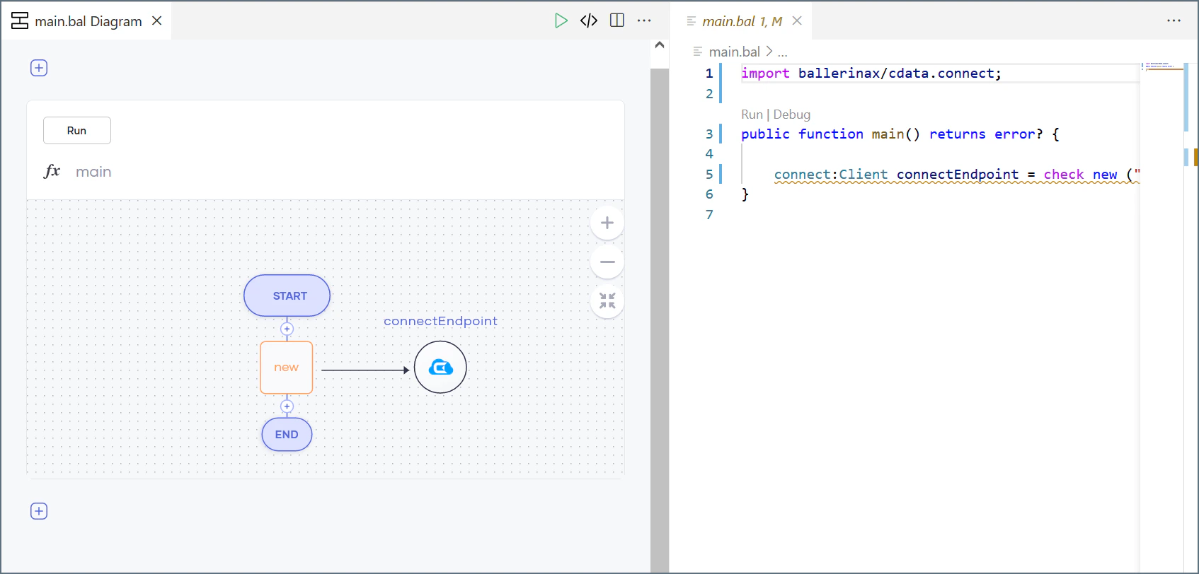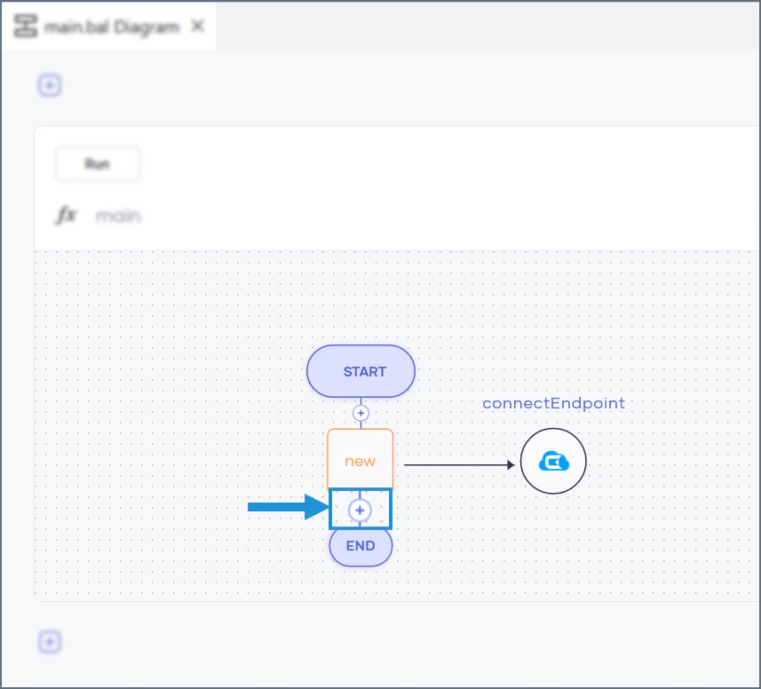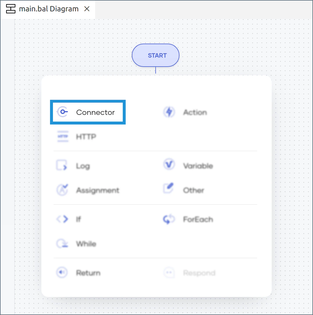 The main construct appears in the diagram view. In the menu that appears under Start, click Connector.