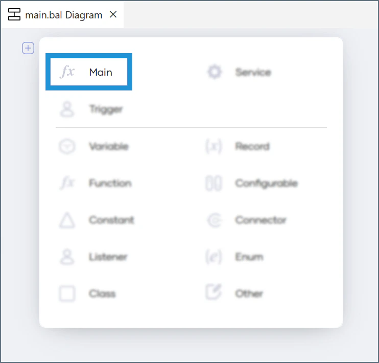 Choreo prompts you to create a new construct. Click the indicated button to open a list of options, then select Main.