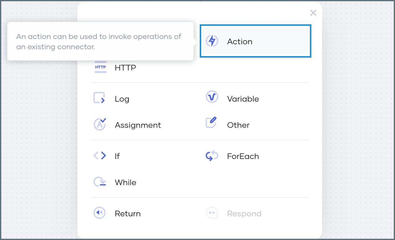 To add an Action to your application logic, click the + icon between the new and End nodes.