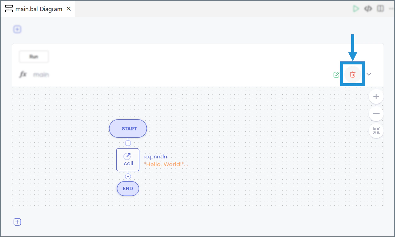 Choreo automatically generates a construct in the low-code diagram view. Delete this construct by highlighting it and clicking the delete icon.