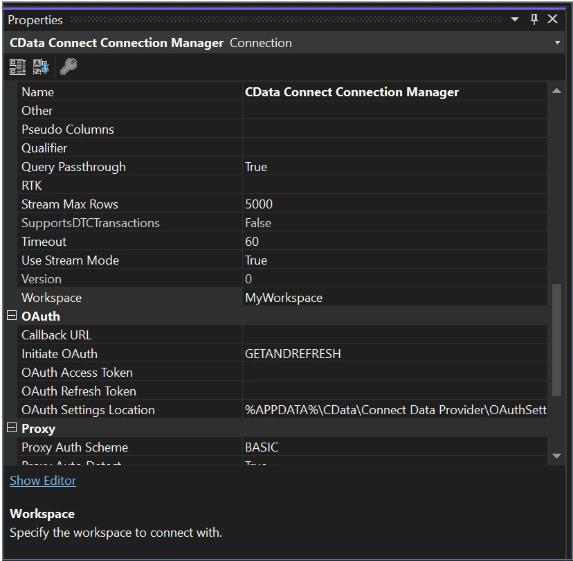 To connect the SSIS client to a specific workspace, you specify the workspace name in the Workspace field of the Connect AI Connection Manager.