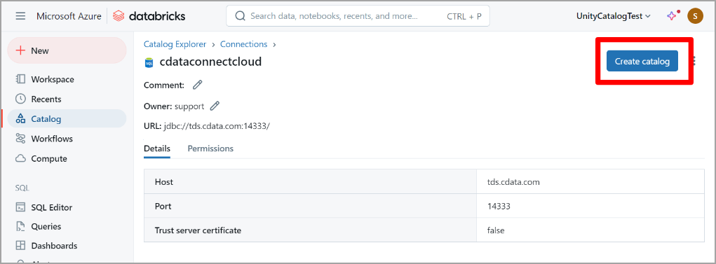 Databricks Lakehouse Federation からConnect AI の仮想SQL Server API へのコネクションを確立するには以下の手順に従います。接続を作成で以下を入力します: