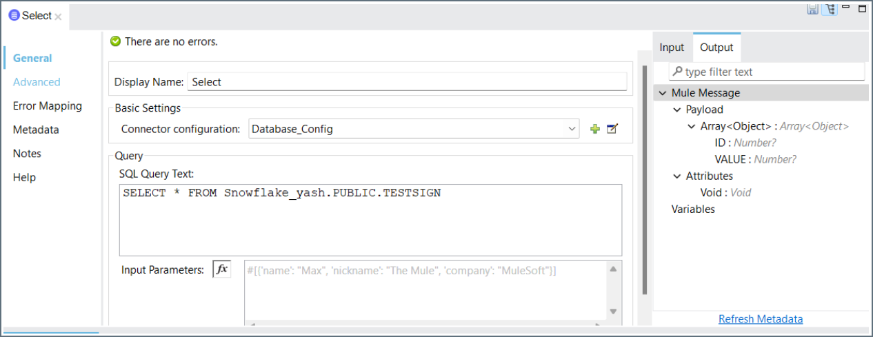 If the connection is successful, provide the SQL Query Text in the editor. You can see the metadata of the table on the right side in the Output tab.